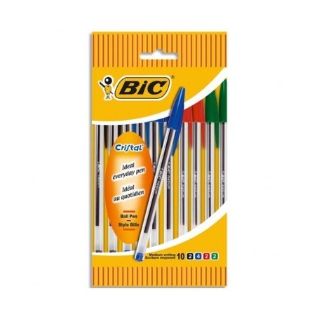 BIC Pochette de 10 stylos à bille pointe moyenne 4 couleurs d’encre corps plastique transparent CRISTAL